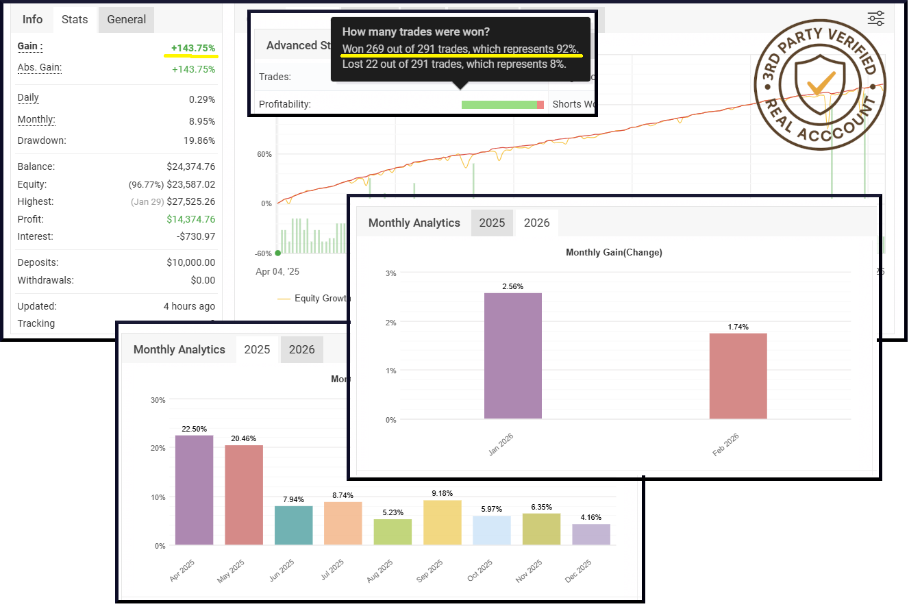 With over 90% win rate, Zone Hunter Robot uses multi-timeframe mean reversion analysis to identify overbought and oversold conditions, delivering verified performance while protecting your capital.