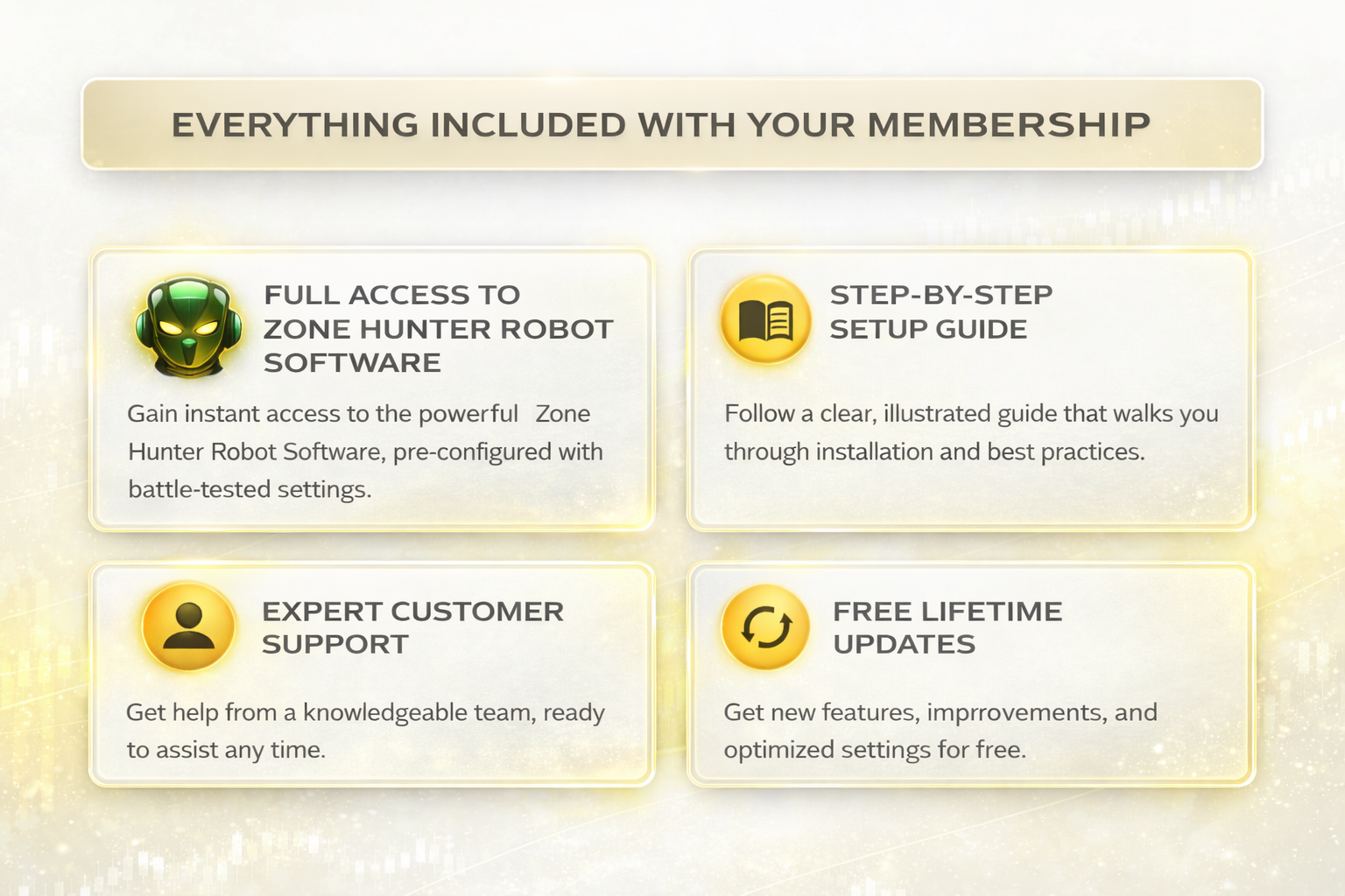 Go ahead and try Zone Hunter Robot. You can sign up today, download your copy and test it on a demo or live account for up to 30 days. If you are not satisfied for any reason just send us an email and we'll refund you - for any reason.